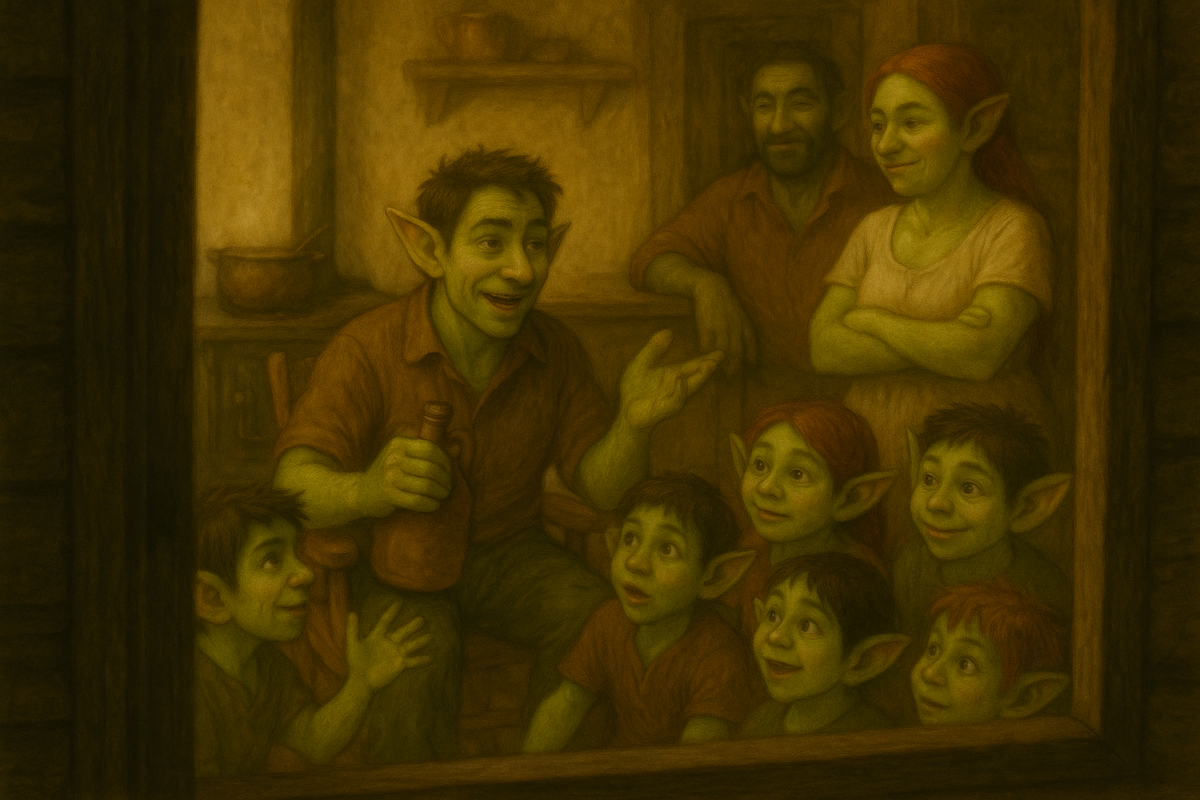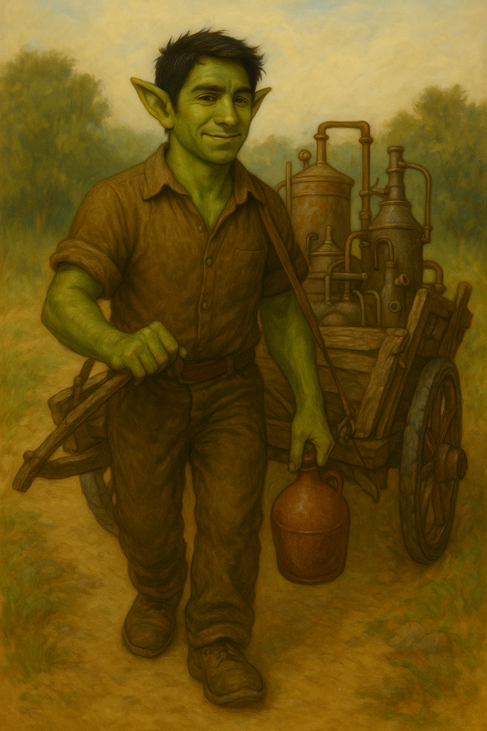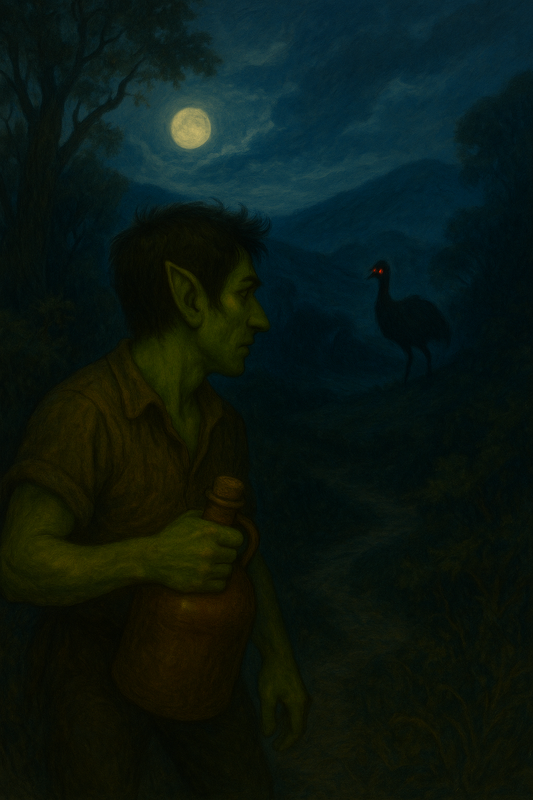 It’s said that long ago, Pa got himself stuck on a human merchant ship bound for the edge of the world. Hid in crates, slept in barrels, survived on stolen potatoes. Washed up in a place called Oz. Not the one with wizards, tornados, and flying houses. No, this Oz was hotter, harsher. Full of bush goblins sharp as glass, burnin’ with sun and spells made of red dirt and beetle wings. Pa stayed longer than he meant to. Might’ve been the magic. Might've been the heat. Might’ve been the goblin girl who wore snake bones in her ears and cast a spell upon him. Rumors in the holler were that out of this mix came a goblin baby, but no one was ever able to confirm it.