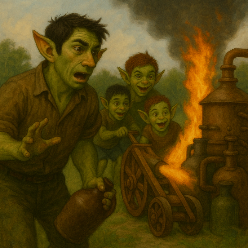 And Uncle Kinxy? He just hums, whistles, or sings “Little Brown Jug” and keeps workin’. His war style ain’t like Pa’s. Where Pa’s methodical, Uncle Kinxy’s full charge, shock and awe, strike fast and clean. He leads when Pa ain’t around, and war ends before some cousins even lace their boots. Sometimes that means goblins like Ma find their carefully studied targets already scorched, replaced with bases no one’s been able to crack.